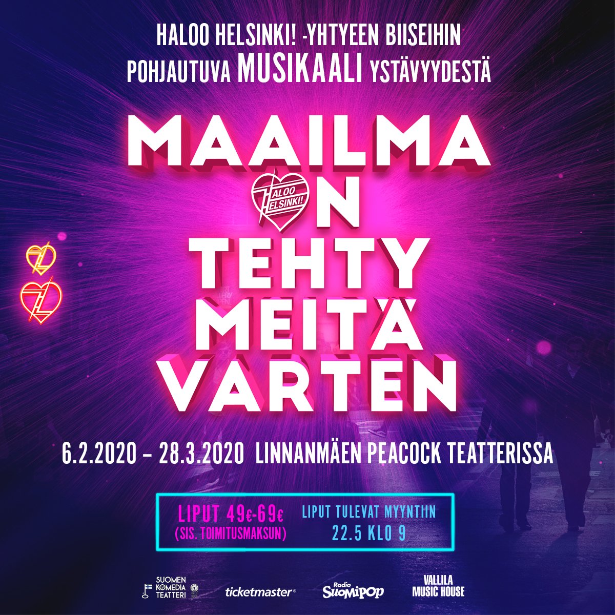 Haloo Helsinki! -yhtyeen musiikkiin pohjautuva Maailma on tehty meitä varten musikaali saa kantaesityksensä Linnanmäen Peacockissa 6.2.2020. Musikaalin käsikirjoittavat Kiti Kokkonen ja Jenni Pääskysaari.