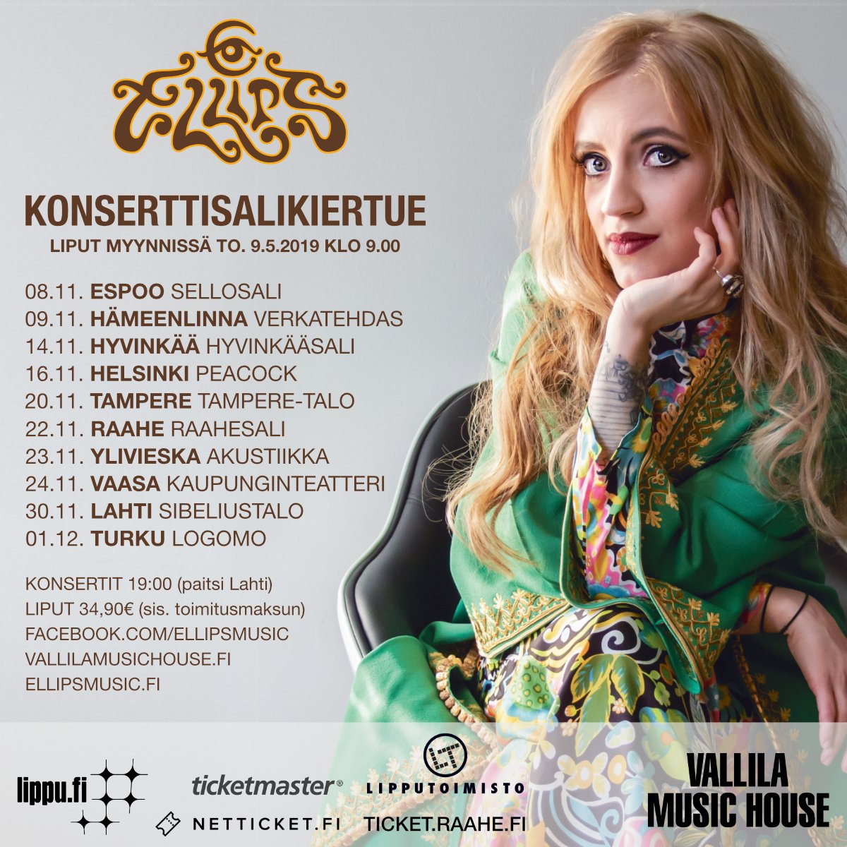 Haloo Helsinki! -yhtyeen solisti Elli Haloon sooloprojekti Ellips nähdään Konserttisalikiertueella ensi syksynä seuraavilla paikkakunnilla..
